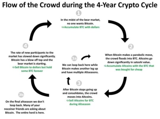 Đâu tiên mình sẽ kể cho các bạn kịch bản điển hình trên thị trường. Một người mới vào thị trường sẽ không biết gì cả, và lúc đó sẽ mua những coin quen thuộc cơ bản như BTC, ETH, BNB. Sau đó thấy cũng bình thường, à không có gì quá khó khăn vô mua crypto, coin tăng giá rất bình thường. Sau đó phát hiện ra thị trường này có nhiều coin khác mà mức độ tăng trưởng còn dữ dội hơn BTC, ETH nữa, nhiều coin X10, X100, X1000. Thế là từ đó bắt đầu fomo. Mua những coin nổi, thấy tiếp tục lên X2, X3 nhanh chóng quá và thị trường có vẻ tăng liên tục, càng ngày càng cao. Nhất là lúc thị trường nóng ngày nào cũng có con ATH, X2 là câu chuyện nhỏ, bây giờ người ta chờ đến X6, X7. Người dùng tiếp tục bơm tiền vào nghĩ ngon ăn, cho tới lúc đó, cá mập ra tay bán trên thị trường, và tất nhiên nuốt tất cả cá con vào bụng. Những bạn nào đã vào thị trường chắc sẽ hiểu điều này. Khi bạn thấy tài khoản tăng liên tục, tất cả những người nói về thị trường với kỳ vọng tốt đẹp và bạn nghĩ thị trường sẽ không bao giờ sụp. Tuy nhiên thị trường Crypto khác thị trường chứng khoán ở điểm nó sẽ sụp bất cứ lúc nào mà bạn không biết, và nó có thể sụp chỉ trong vòng 15 phút khiến bạn trở tay không kịp. Vậy nên hãy hiểu chu kỳ này để kiểm soát lòng tham của mình.