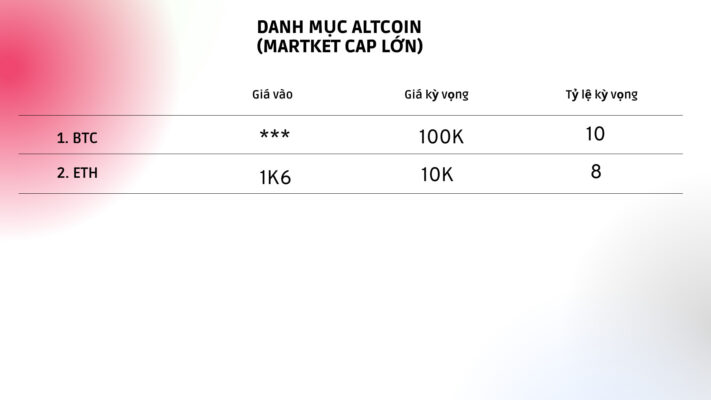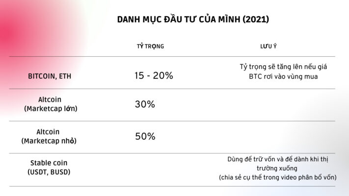 Thực tế BTC và ETH có tăng cũng khó đạt đc mức X3, X5 chứ chưa nói đến X10, X100 vì vốn hóa của nó quá lớn. Và mình chọn những lúc thị trường giảm, mình sẽ gom BTC vào ở mức giá tốt, lúc đó tỷ trọng BTC có thể chiếm 20% danh mục. 30% danh mục của mình dành cho altcoin có market cap lớn, vì kế tiếp BTC các altcoin lớn này cũng khó bay mạnh được. Và cuối cùng phần lớn danh mục của mình dành cho altcoin market cap nhỏ vì như mục đích ban đầu mình muốn kênh này để đột phá tài sản nên mình quyết định sẽ đi hướng rủi ro hơn. Còn lại một ít mình sẽ bỏ vào stable coin dành cho thị trường những lúc downtrend có vốn mua vào, mình sẽ nói cụ thể hơn trong video phân bổ vốn.