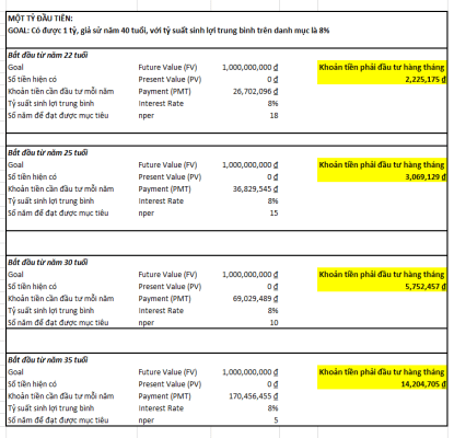 Hôm nay chúng ta sẽ đi giải quyết nốt bài toán còn lại là muốn có được 1 tỷ đồng thì mỗi tháng phải đầu tư bao nhiêu tiền? Và như mọi khi mình sẽ chia ra theo từng độ tuổi để các bạn dễ tham khảo.