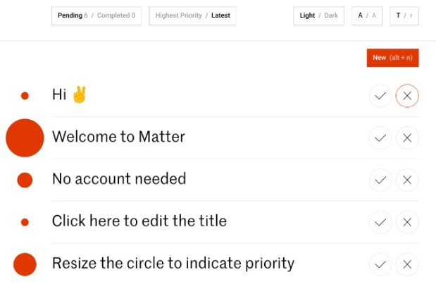 Matter rất dễ sử dụng. Bạn chỉ cần vào trang web, một giao diện như trên hình sẽ ngay lập tức hiện ra và bạn có thể bắt đầu gõ xuống những công việc cần làm. Để thể hiện mức độ ưu tiên của các công việc, hãy nhấn vào vòng tròn và thay đổi kích thước của nó. Vòng tròn càng lớn, nhiệm vụ càng quan trọng, cần làm phải trước nhất.