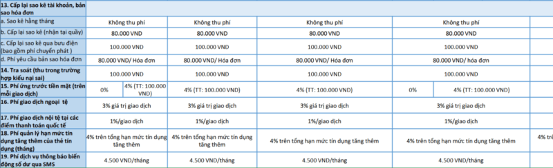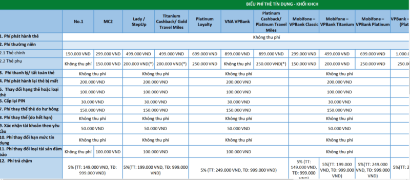 2. Các khoản phí của thẻ tín dụng VP Bank