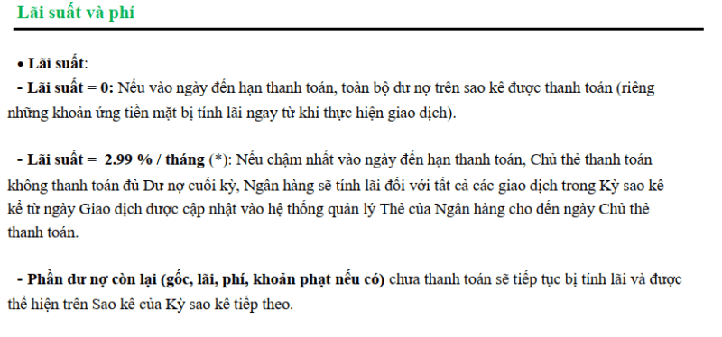 “Nếu chậm nhất vào ngày đến hạn thanh toán, Chủ thẻ thanh toán không thanh toán đủ Dư nợ cuối kỳ, Ngân hàng sẽ tính lãi đối với tất cả các giao dịch trong Kỳ sao kê kể từ ngày Giao dịch được cập nhật vào hệ thống quản lý Thẻ của Ngân hàng cho đến ngày Chủ thẻ thanh toán.”