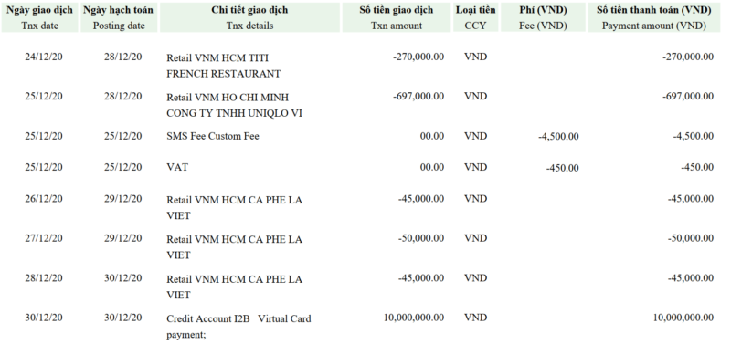 Mình ví dụ ngày 20.1 bạn nhận được sao kê tổng tiền là 10 triệu, bạn được hạn tới ngày 5 phải thanh toán hết 10 triệu này.