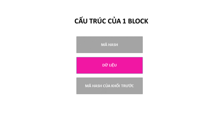 1 block có cấu tạo gồm 3 phần : 1 phần Hash, hash của block trước nó và 1 phần chứa dữ liệu hay còn gọi là sổ cái. Mối Hash là duy nhất gồm một chuỗi số phức tạp không lặp lại. Nó được ví như là dấu vân tay, không bị lặp lại.